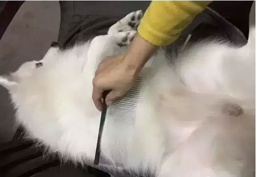 6. 如果狗狗毛發(fā)較厚,梳子難以梳透,可以一層一層分開(kāi)梳理,先梳理被毛,梳順之后掀開(kāi)再梳理底絨,最后再統(tǒng)一梳理。